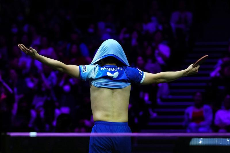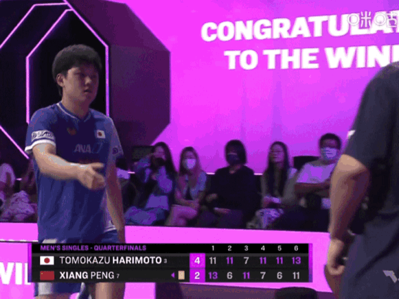 当时,在4-2战胜向鹏后,张本智和非常激动,他撩起上衣、盖住头疯狂庆祝胜利。