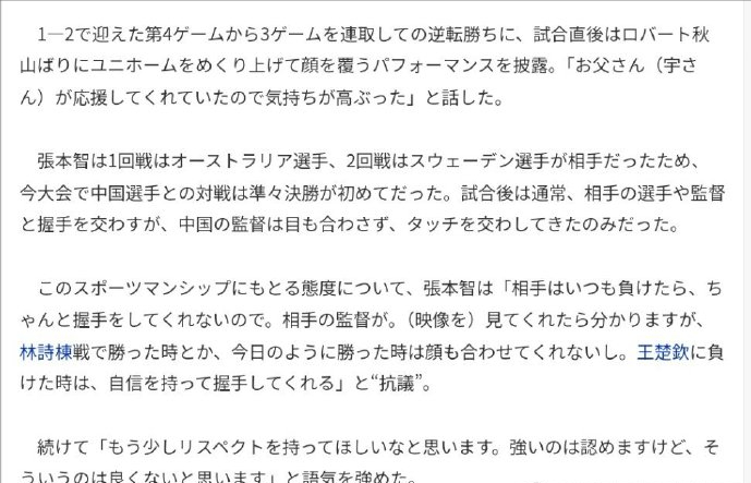 张本智和说:“对方教练总是这样,输了球就不认真握手。看视频就知道,无论是赢了林诗栋的时候,还是像今天我获胜的时候,他们都不肯正眼看你。但要是我输给了王楚钦,他们就会面带自信来握手。”